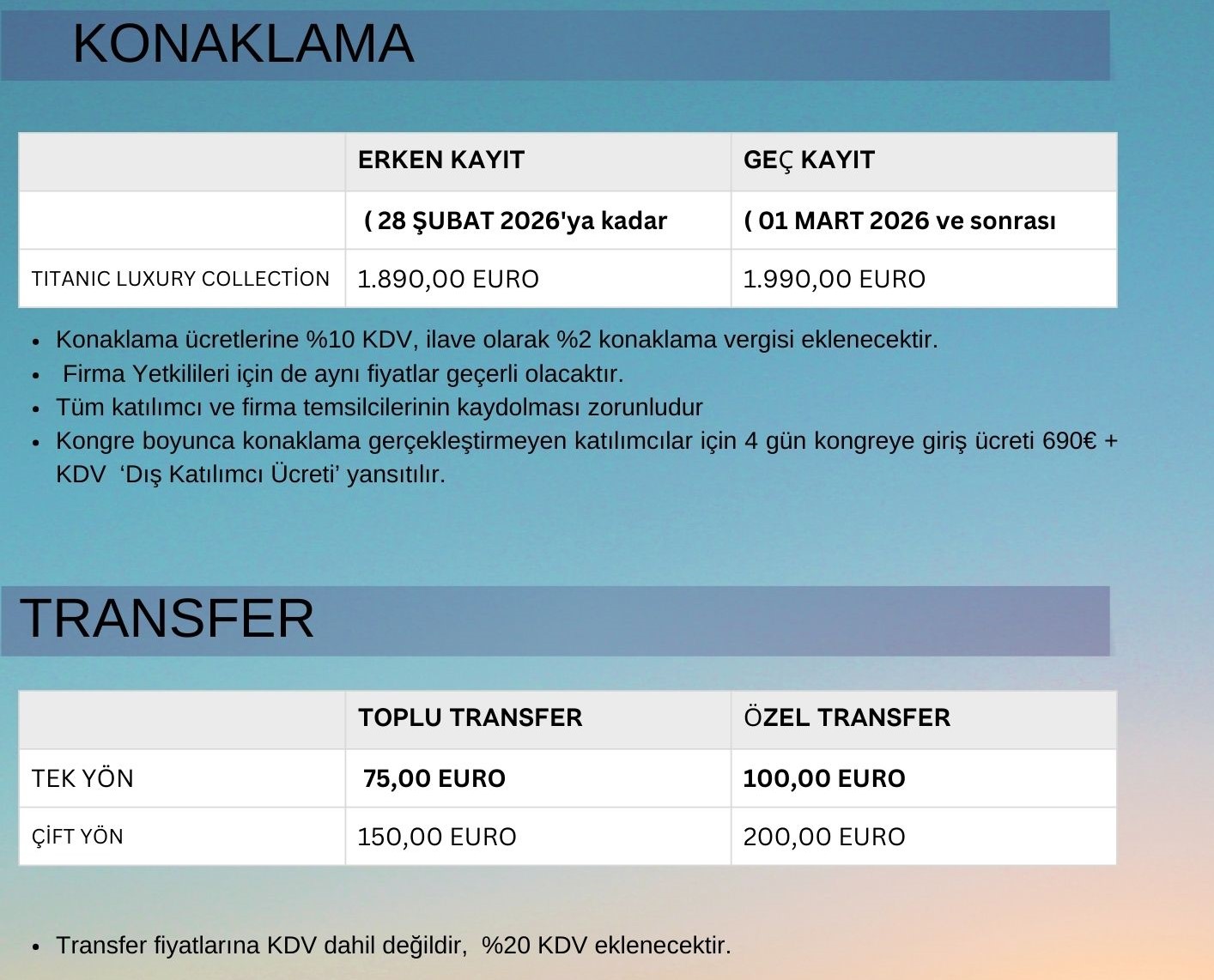 • MGL Mice aracılığı ile kongre otelinde konaklamayan katılımcılar kayıt ücretinin yanı sıra “Dış